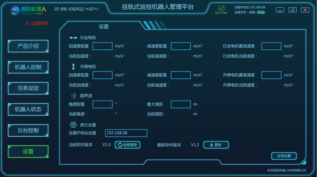 項(xiàng)目主要由移動(dòng)機(jī)器人本體、軌道系統(tǒng)、采集設(shè)備、定位系統(tǒng)、供電和通信系統(tǒng)、后臺(tái)系統(tǒng)等結(jié)構(gòu)組成。在巡檢工作過程中,由用戶設(shè)定任務(wù)點(diǎn),加裝采集設(shè)備,移動(dòng)機(jī)器人根據(jù)控制指令在軌道上運(yùn)動(dòng),將采集設(shè)備運(yùn)送到指定位置采集數(shù)據(jù),且滿足所需要的負(fù)載量,速度;在機(jī)器人行駛過程中可實(shí)現(xiàn)自主爬坡、采集設(shè)備可根據(jù)監(jiān)測(cè)物體高度進(jìn)行升降調(diào)整等功能;配套的調(diào)試軟件支持手動(dòng)、控制移動(dòng)平臺(tái)運(yùn)動(dòng);具有較強(qiáng)的適用性及拓展性,可自定義模塊搭配,自主設(shè)定任務(wù)點(diǎn),自動(dòng)巡檢、定點(diǎn)采集、自動(dòng)充電等功能。
